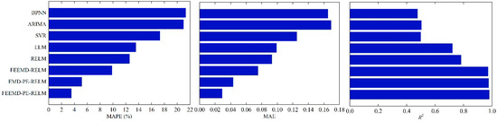 Forecasting accuracy comparison of the eight models. RELM—regularized extreme learning machine; MAPE—mean absolute percentage error; MAE—mean absolute error; R2—coefficient of determination.