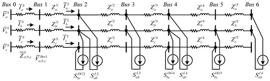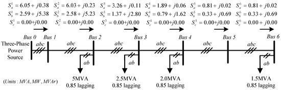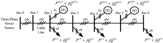 Figure 1 presents a radial-type microgrid with unbalanced DGs and loads. The microgrid is a three-phase, three-wire, seven buses, radial-type microgrid with unbalanced (single-phase) DGs and loads. These single-phase DGs are connected between phase b and phase c at Bus 2, 4, 5, and single-phase loads are connected between phase a and phase b at Bus 2, 3, 4, and 6. The proposed shunt compensator can be installed on selected buses to improve the EPQ and achieve bidirectional power-flow balancing.
