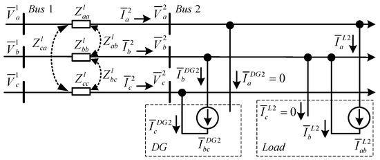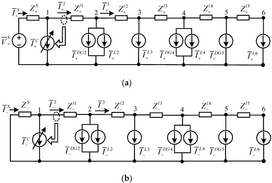 The symmetrical components method can simplify the unbalanced microgrid system for conducting a steady-state analysis. The required compensation principle of the proposed shunt compensator can also be derived. Figure 2 presents the equivalent circuit model between two neighboring buses in Figure 1. Equation (1) can be obtained by applying Kirchhoff’s Voltage Law. Equation (2) presents the impedance matrix of the three-phase distribution lines, where , , and are self-impedance and , , and are mutual impedance. In general, the mutual impedance can be neglected in a power distribution system [25]. By combining Equations (1) and (2), Equation (3) is obtained. By using the symmetrical components method, the sequence networks are derived by using Equation (4). In Equation (4), T is the symmetrical components transformation matrix and T−1 is the inverse symmetrical components transformation matrix, as presented in Equation (5).