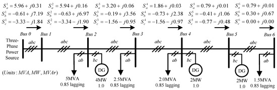 Radial-type, three-phase microgrid with unbalanced distributed generators (DGs) and loads.