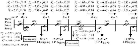 Figure 10 shows the power flow in Case 3, and Table 4 summarizes the test results, respectively. Compared with Case 1, with the assistance of the compensators, the VURs of all buses were significantly improved to be within the industrial limit value. The VRs and power factors of all buses were also improved. It is observed in Figure 10 that the two compensators at Bus 1 and Bus 4 regulated the unbalanced power flows between the unbalanced load/DG and the power source side. As a result, the power source side offered balanced three-phase powers with unity power factor at Bus 1 and Bus 4.