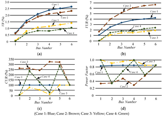Comparison of all cases. (a) Voltage regulation; (b) voltage unbalance ratio; (c) current unbalance ratio; (d) power factor.