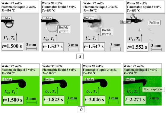 In terms of practical importance, the experimental research proved that it is possible to provide adequate high-temperature liquid treatments by the explosive breakup of droplets containing various components in various proportions. In chambers used for high-temperature evaporation and the burnout of impurities, multi-component droplets swirl through high-temperature turbulent and pulsating gas media. Therefore, droplets are heated almost uniformly throughout their surface until they reach the conditions sufficient for heat removal (droplet cooling), e.g., when a droplet is fixed on a holder [15,16] or its substrates [17]. The fixation scheme of a two-component droplet on a holder, chosen in this research, is fully in line with such conditions. This scheme provides adequate evaluation of the main parameters of high-temperature liquid treatment from any impurities promoting a rapid (explosive) breakup of multi-component droplets (e.g., slurries, emulsions, and solutions).