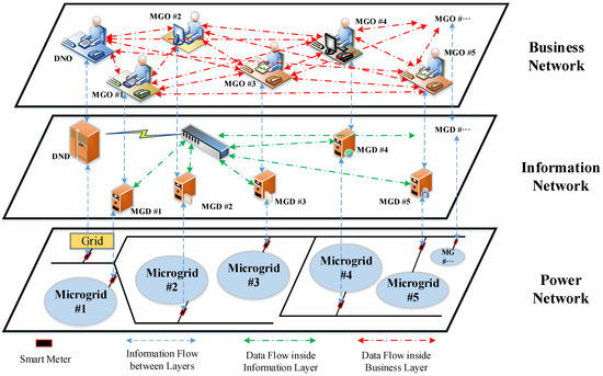 The business network is a P2P network enhanced by a blockchain for developing various kinds of business models that determine the energy trading strategy with peers and the grid. Microgrid Operators (MGOs) are authorized to participate in P2P energy trading in the local distribution network under the energy market regulations formulated by the distribution network operator (DNO).