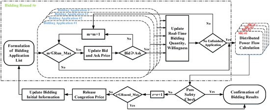 During this time slot, bidding applications are presented individually by each MGO. A bidding round (indexed by r) starts when applications are formulated in a list. In each run of a round (indexed by m), the buyer/seller updates the ask/bid price with multidimensional willingness. If one of an application results in a deal, all MGOs update their real-time bidding quantities and willingness parallelly. A bidding round ends when there is no unfinished application in the list or the time deadline is reached (). The distributed power flow is calculated by each MGO to reduce the computational pressure on the DNO. If the bidding result passes the safety check, energy trading commands are generated and sent to each MGO. Otherwise, a congestion price is calculated by the DNO to reflect the severity of power line congestion and the extent of each transaction’s impact on overall congestion, which will obviously affect bidding applications in the next round. A maximum of rounds of bidding is allowed to be performed within a time slot. Detailed variable setups are presented in the following paper.
