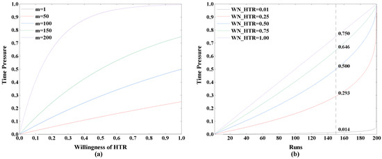 Time pressure is an important factor in a bidding process. The MGO is willing to close a deal when the deadline is approaching. This kind of behavior will help MGOs gain more transaction opportunities and, consequently, enhance their profits. Meanwhile, the historical trading records have a significant influence on the degree of concession during a round. A microgrid with lower the willingness of historical trading records prefers to wait for more profit to accrue from each unit of energy instead of finishing the deal quickly, while a microgrid that seldom makes any transactions will give ground quickly to reach a deal. On the basis of the prior work of [29,32], the representation of time pressure is modified and designed by the following equation:
