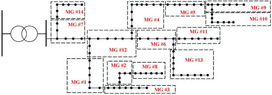 A realistic case of microgrids in Guizhou Province, China, was used to validate the proposed P2P energy trading mechanism. As shown in Figure 5, the distribution network consists of 14 microgrids. The distance matrix is given in Table A1, from which the transmission price for each kWh of energy between any two microgrids can be calculated. The power of these microgrids after the internal coordinated dispatch is presented in Figure A1.