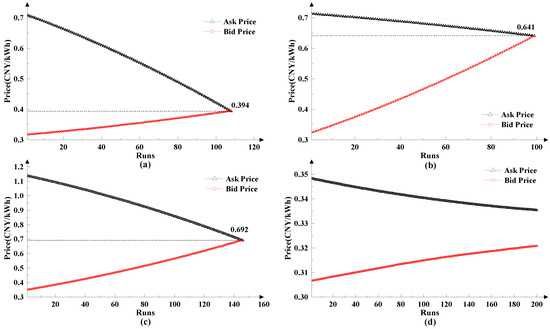 As the seller in Figure 6a, MG 9 fails in two of three previous time slots, so the willingness of historical trading records for MG 9 is markedly increased in this round, which causes the asking price to drop quickly to reach a deal. On the contrary, in time slot 15, MG 13 has a low willingness, as it succeeded in all previous three rounds, and it desires to gain more profit from each unit of clean energy. Pairing with MG 5, who holds a higher bidding willingness, the deal is closed at 0.641 CNY/kWh, as shown in Figure 6b. It can be observed from these two runs that microgrids with a greater willingness will make more compromises to reach a deal quickly. Figure 6c presents a well-matched bidding process of MG 1 and MG 14, as they have comparable willingness in this bidding round. Figure 6d shows the bidding result of microgrids where both the buyer and the seller have a very low willingness. It can be seen that an agreement cannot be reached before the deadline of negotiation because neither MG 4 nor MG 8 is willing to make a concession to close the deal.