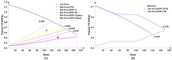 To illustrate the influences of different dimensions of expressing willingness on the bidding results, two more simulations were conducted. In Figure 7a, the asking price of MG 10 in the 34th time slot is maintained during this bidding round to test the influence of a multidimensional willingness on the bid price. If the willingness of MG 2 is set at a fixed number, the bid price depends greatly on this predetermined parameter as the slope of the price curve. For the bid price under a low and high multidimensional willingness, the bidding step can better respond to historical trading records, time pressure, the real-time supply-demand relationship, and other factors. For example, as time approaches the deadline in one round, both of the traders are willing to increase the bidding step in case of a failed round. In the proposed parallel multidimensional willingness bidding process, the bidding quantity and willingness will be updated if other bidding applications reach a deal and the relationship between the supply and demand change. In this case, one bid price curve is divided into several parts, as shown in Figure 7a by the updated points A and B. A bidding round is forced to stop when no more energy is left to be traded or the deadline is reached.