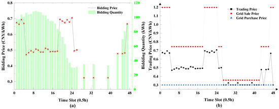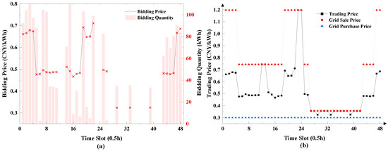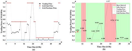 (a) Actual trading price of MG 12 in a 24 h trading cycle; (b) detailed trading performance of MG 12 between the 9th and 32rd time slot.