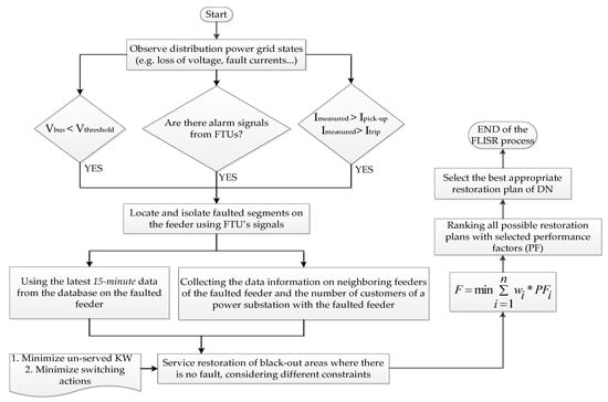 Flow diagram of a proposed FLISR approach for smart distribution networks.