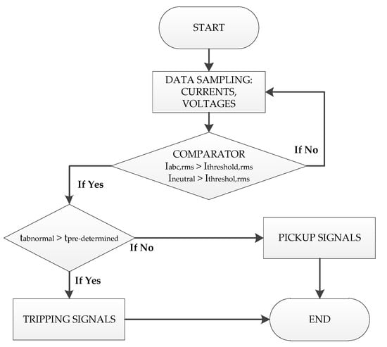 Figure 4 shows the operating principle of overcurrent relays in a distribution network. The measured phase/neutral currents are compared to the pre-set RMS current values (Ithreshold, rms). If the measured phase/neutral current value is larger than a threshold value, the relay/recloser continues to perform a comparison between the abnormal operation time (tabnormal) from the fault inception time and the pre-defined fault detection time (tpre-determined). When the time tabnormal exceeds the time tpre-determined, the relays/reclosers will give a tripping signal to circuit breakers. Otherwise, they will alarm the abnormal operation of distribution network without any switching actions. It is noted that threshold current values are determined according to different load characteristics in the distribution network. When the measured phase/neutral current value exceeds the tripping threshold, different fault types can be also identified in the distribution network: