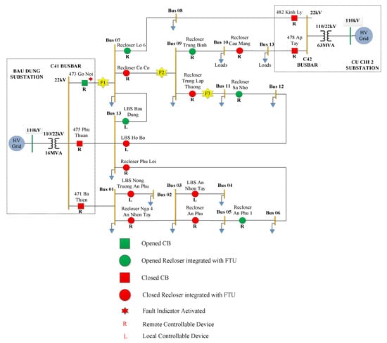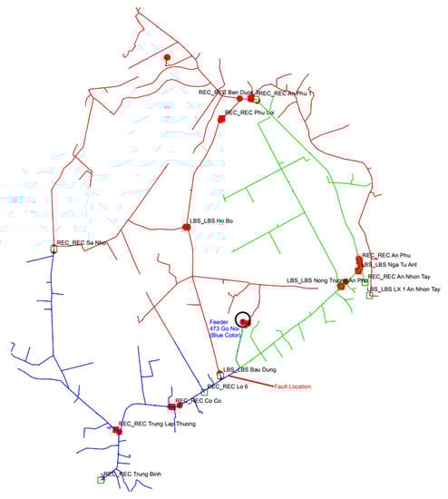 Figure 6 shows a single-line diagram of real 22 kV distribution network. The BAU DUNG power substation contains three main feeders, namely, 471 Ba Thien (blue lines), 473 Go Noi (green lines), and 475 Phu Thuan (red lines) as seen in Figure 7. A 16 MVA 110/22 kV power transformer is used in the power substation. Three main circuit breakers are installed at three terminals of all the feeders. Circle and square symbols are represented for normally opened/closed load-break-switches/reclosers and circuit breakers, respectively. A tie-switch between the 471-Ba-Thien feeder and the 475 Phu-Thuan feeder is an An-Phu-1 recloser (signed by REC An-Phu-1). The load-break-switch (LBS Bau Dung) and a recloser (REC Sa Nho) are used to configure a ring topology between the 475 Phu-Thuan feeder and the 473 Go Noi feeder. In addition, a recloser Lo 6 (REC Lo 6) and a recloser (REC Trung Binh) are normally opened reclosers. These reclosers will be closed when the BAU DUNG power substation is overloaded or has other abnormal operation situations. A CU-CHI-2 back-up power substation contains a 63 MVA 110/22 kV transformer with two main feeders, a 482 Kinh Ly feeder and the 478 Ap Tay feeder. The former feeder uses the REC Lo 6 to connect to the BAU DUNG power substation, while the latter feeder is connected to the BAU DUNG substation due to the REC Trung Binh. It is noted that all reclosers are supported by SCADA functions for remotely monitoring and controlling of switching operations. For example, when a fault occurs, the reclosers will be activated to isolate the faulted section, and right after the FLISR tool will propose all possible solutions for the best service restoration of DN based on the abovementioned objective function and constraints.