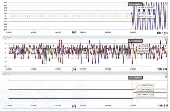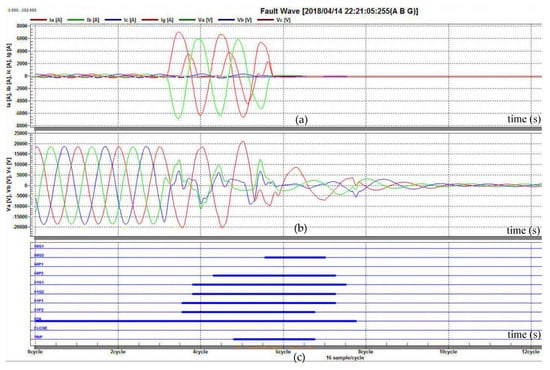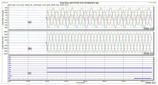 Fault waveforms corresponding to a TPGF at F3: (a) three phase currents, Ia (A), Ib (A), Ic (A), and a ground current Ig (A)); (b) three phase voltages, Va (V), Vb (V), and Vc (V); (c) tripping signals of the Co-Co recloser (51P2 and 51G2 are respectively phase and ground tripping signals; a TRIP signal shows the tripping action implemented by the recloser).