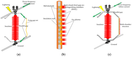 The parallel gap is a well-known “dredging” type of lightning protection device, widely used in transmission and distribution lines [1,2]. When the parallel gap is broken down due to a lightning strike, a stable power frequency follow current (arc) is built between the parallel gap (Figure 1a). The arc moves far away from the insulator along the parallel gap driven by the electromagnetic force, thus protecting the insulators and lines from the burning arc, and preventing the breakage accidents caused by arc ablation after lightning flashover [3]. However, it cannot actively extinguish the arc. The lasting arc could burn the parallel gap device and destroy its protection performance. The lightning trip-out rate will also increase due to the lasting arc. Therefore, it is crucial to retrofit the parallel gap with arc-extinguishing capability for lightning protection.