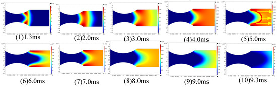 Figure 11 is the arc extinction process in the optimized multi-chamber structure. The arc jet length in the optimized structure at the same time is obviously longer than that in the basic structure by comparing Figure 10 (1)–(2) and Figure 11 (1)–(2). This indicates that the airflow velocity in the optimized structure is greater than that in the basic structure. The arc plasma is gradually ejected from the inside to the outside of the chamber.