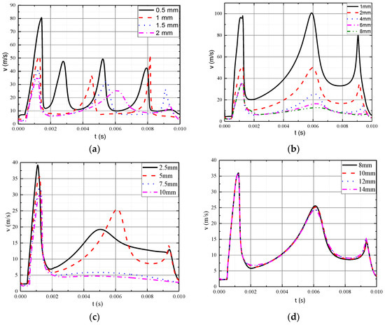The variation of airflow velocity under various parameters is shown in Figure 4. The variation of airflow velocity with electrode spacing is shown in Figure 4a. It depicts that the airflow velocity oscillates with the time. When the gap is 0.5 mm, the airflow velocity reaches the first peak at 1.44 ms, and then reaches the three other peaks at 2.78 ms, 5.23 ms and 7.93 ms, respectively. There are four peaks in 10 ms, of which the amplitude of the first peak is the largest. When the gap varies between 1 mm, 1.5 mm and 2 mm, there are three peaks of airflow velocity in 10 ms. The first peak of gas velocity increases by 1.14, 1.43 and 2.24 times when the spacings are 1.5, 1 and 0.5 mm, respectively. It indicates that the shorter the gap, the greater the peak of gas velocity. The only difference is that when the gap is 1 mm, the third peak of gas velocity is larger than the third and fourth peaks of the 0.5 mm gap, which is close to the zero-crossing point of arc current (t = 10 ms) and more conducive to arc extinction. The arc chamber with a 1 mm gap between the electrodes is more conducive to extinguishing the arc than the one with a 0.5 mm gap.