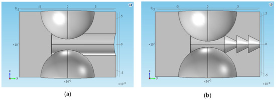According to the influence of the chamber size on the airflow velocity, the basic SSAC can be optimized. Figure 5a,b illustrate the 3D sectional view of the basic SSAC and optimized one, respectively. Comparing the two structures, the radius of the electrode stays the same as 5 mm, the distance between the electrodes is reduced from 2 mm to 1 mm, and the diameter of the outlet is reduced from 4 mm to 1 mm. Considering that the opening diameter of the SSAC has a significant influence on the airflow velocity, there are 1 mm protrusions at 1/3 and 2/3 of the horizontal distance between the electrode and the outlet to accelerate the airflow velocity in the nozzle pipe. This design could be called “multi-stage converging-diverging structure” in this paper.