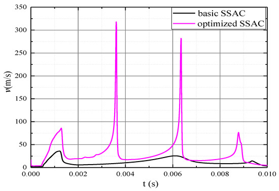 Figure 6 is the time-varying curve of the airflow velocity amplitude in the basic SSAC and the optimized one. It shows that the airflow velocity in the basic SSAC contains three peaks, while there are four peaks in the optimized one. Compared with the basic one, the airflow velocity in the optimized SSAC is significantly inceased. The first peak reaches its the maximum velocity (36 m/s) at 1.23 ms, while the maximum velocity in the optimized structure occurs at the second peak at 3.61 ms and it is 318 m/s, which is 8.83 times that of the basic SSAC. The third peak velocity in the optimized SSAC is 282 m/s (7.83 times).