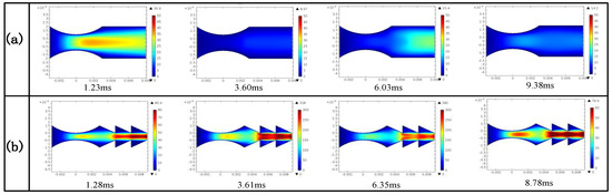 Figure 7 illustrates the velocity distribution of airflow at different times in the optimized SSAC and basic SSAC when the arc current is constant (1000 A). Figure 7a shows that the airflow velocity in the basic SSAC is significantly lower than that in the optimized one. In the basic SSAC, the airflow velocity changes slowly, and the peak airflow velocity mainly appears in the gap between the electrodes and near the outlet (see 1.23 ms and 6.03 ms). Figure 7b depicts that the peak airflow velocity of the optimized SSAC mainly distributes between the electrode gap and converging-diverging structure, and the airflow undergoes “two accelerations” due to the two-stage onverging-diverging structure. It shows that the optimized SSAC with multi-stage converging-diverging structure can significantly increase the airflow velocity in the chamber than the basic SSAC. The increasing airflow velocity contributes to the extinction of the arc.