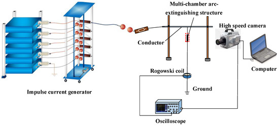 In order to analyze the arc extinction characteristics of the multi-chamber arc-extinguishing structure, a test platform is set up, as shown in Figure 8. The impulse current generator is charged by 380 V AC power supply through boosting and rectifying. The rated DC charging voltage of the capacitor bank can reach 100 kV, and the maximum short-circuit output current can reach 200 kA. A Rogowski coil current sensor is used to measure the current flowing through the multi-chamber structure. Its maximum permissible peak current is 20 kA. The multi-chamber arc-extinguishing structure is suspended below the conductor. The upper end of multi-chamber arc-extinguishing structure is in electrical contact with the conductor and the lower end is grounded. Once the multi-chamber arc-extinguishing structure is broken down, the oscilloscope gives the trigger signal to the high-speed camera, and arc extinction process in multi-chamber is photographed by the high-speed camera. The high-speed camera used is a FASTCAM SA5 (Photron, San Diego, CA, USA) equipped with a 12-bit monochrome chip (36-bit RGB color) and 20-μm pixels. The frame speed can be adjusted according to the pixels, up to 1,000,000 fps. The camera is controlled by Photron’s Fastcam Viewer (PFV). In this test, the applied current is 2 kA with a standard lighting pulse waveshape of 8/20 μs. We perform experiments applying impulse current of 8/20 form to observe dissipation characteristics of arc and to verify the effectiveness of the optimized SSAC structure.