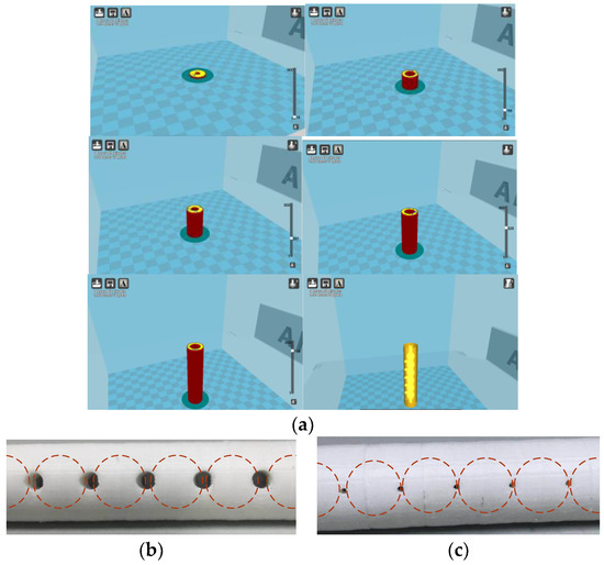 The specific size of the basic structure and optimized structure is shown in Section 3. 3D printing technology is utilized to print the multi-chamber products. 3D printing is a kind of manufacturing technology which takes a 3D digital model file as input, glueable and solidifiable materials as raw materials, and adopts layered printing and layer-by-layer accumulates the material to construct objects. This kind of manufacturing technology does not need traditional tools or molds, and can realize the manufacture of a complex structure which is difficult or impossible to process by traditional technologies, and can effectively simplify the production process and shorten the manufacturing cycle. We use the fused deposition model (FDM) in 3D printing technology and polylactic acid (PLA) as the printing material. Polylactic acid is a biodegradable polymer which causes no pollution to the environment. The electrical properties of PLA [34] have been studied. The volume resistivity, dielectric constant, dielectric loss of PLA are similar to that of crosslinked polyethylene, and the pulse breakdown strength of PLA is 1.3 times that of the crosslinked polyethylene. Therefore, polylactic acid materials were selected to print multi-chamber structure samples. The printing process of 3D printer and the multi-chamber structure printed product are shown in Figure 9.