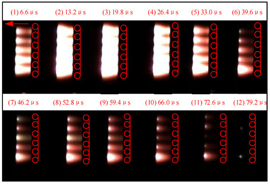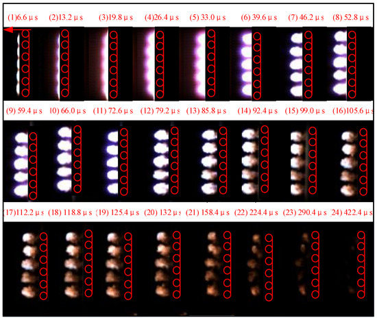 Figure 10 shows the arc extinction process in the basic multi-chamber structure. When the multi-chamber arc-extinguishing structure is broken down at 0 μs, the impulse arc is still in the chamber, and the brightness of the arc is strong, as shown in Figure 10 (1) and (2). After 12 μs, the arc current decreases gradually, and the brightness of the arc increases gradually, then decreases, as shown in Figure 10 (3)–(6), because the change of the arc temperature lags behind the change of the arc current due to the fast-changing impulse current. In this process, the arc plasma sprays from the inside to the outside of the chamber. Because of the strong brightness, the arc sprays in the five chambers are almost integrated, and there is no obvious demarcation until 39.6 μs. Then the arc plasma moves outside the chamber, and the arc brightness and arc diameter decrease gradually, as shown in Figure 10 (7)–(11). After 92.4 μs, almost all the arc plasma moves out of the chamber. Under the action of the drift and diffusion of charged particles, the charged particles in the arc plasma gradually decrease, the arc temperature and brightness gradually decreases. The arc is completely extinguished at 422.4 μs, as shown in Figure 10 (12)–(24).