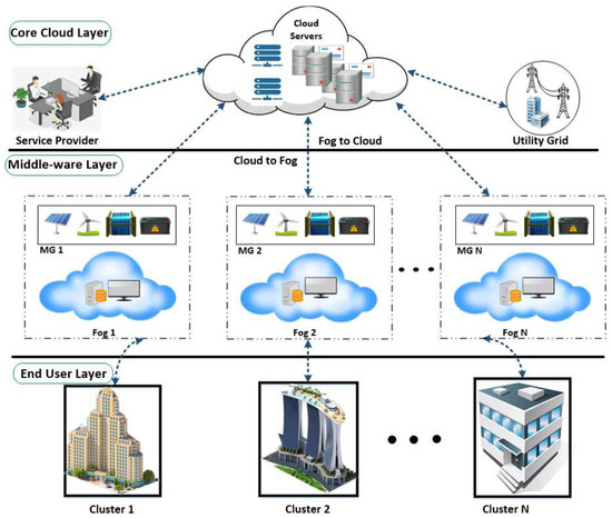 The fog in the fog layer receives requests for energy demand from the cluster of residential buildings and the current status of the MG. On the basis of this information, the fog decides whether energy is supplied from the MG or the utility. The cluster does not directly communicate with the MG and utility. Similarly, in the case of utility, the fog requests the cloud which facilitates the energy demand request from the utility.