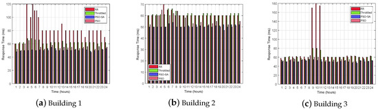 The RT is affected by network latency and the PT. If the average PT of PSO-SA is efficient then RR, PSO are throttled; however, PSO-SA is the most efficient as given in Table 2. The requests from all (three) buildings in respective regions are sent to the fogs for processing. As discussed earlier, the most requests are generated by -1 and -3 and sent to -1 and -3, respectively. In the Figure 4, the PT efficiency on the fogs with RR, throttled and PSO are compromised; however, PSO and PSO-SA have lesser PT. In -2 there is a lesser number of requests as compared to -1 and -2 to process. The PT of PSO is more compromising than PSO-SA in -2. These hourly performances for PT in -2 show that proposed PSO-SA is most efficient. The performance of RR is compromised when sizes and number of requests are big. Because, partially executed requests sit in wait for their next turn. However, PSO-SA performs efficiently for any number of requests due to efficient local and global solutions.