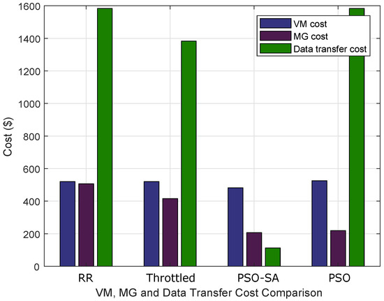 The cost of DT, VM and recurring of MG make the system cost. The recurring cost of MG depends on the load of demand requests which are generated from the clusters of residential buildings. The efficient RT and PT also affect the MG cost. The system or total cost using ORT as SBP with load-balancing algorithms; RR, throttled, PSO and PSO-SA are shown in Figure 5. The total DT cost with PSO and RR is the highest due to waiting of most of the partially executed requests in VM where the probabilistic behavior of PSO is. The DT cost for throttled is more efficient than PSO and RR; however, it is less efficient than PSO-SA. Throttled depends on fixed hardware and VMs specification. It follows fixed rules without performing too much evaluation. This increases the throttled-based DT cost. The PSO-SA has the efficient cost for DT due to the efficiency of local and global solution. The MGs cost has very small variations among the load-balancing algorithms. The recurring cost of MGs depends on number of requests generated from the residential buildings; however, delayed responses from the fog affect the cost. In the Figure 5, PSO-SA has the least MG cost. The load requests are balanced on VMs in the data center. The PSO-SA balances the load requests most efficiently and has the most optimized VM cost.