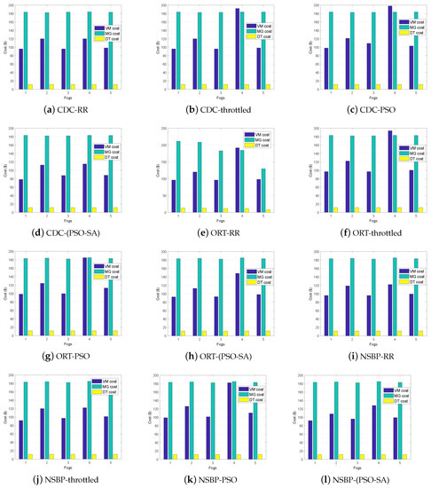 The VM cost in the sub-figures of Figure 6 show that fog-1, fog-3 and fog-5 have close cost using CDC, ORT and NSBP using RR, throttled, PSO and PSO-SA. The physical units for these fogs are same. However, VM cost for fog-5 is higher than fog-1 and fog-3 due to the hundred-fold lesser bandwidth in second hardware unit compared to first hardware unit of its own. The first hardware unit of fog-3 and both units of fog-1 have a thousand-fold lesser bandwidth than second unit of fog-3 which increase the VM cost for fog-3. The fog-4 in all the sub-figures has the highest cost due to large memory and storage size in third physical unit. The proposed NSBP with PSO-SA has the optimized VM cost for all fogs as shown in Figure 6l.