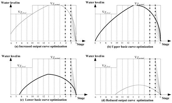 The conventional reservoir operation chart is shown in Figure 1, in which the number of the increased and the reduced output curves can be more than one according to the needs. Here, for the simplified representation, only one increased output curve and one reduced output curve are provided. In Figure 1, the abscissa axis represents the time (month), and the ordinate axis represents the reservoir water level whose upper limit is the flood control level in the flood season the normal storage level in the non-flood season [35]. The curves in Figure 1 from top to bottom are in turn the increased output curve, the upper basic curve, the lower basic curve and the reduced output curve. These curves divide the whole dispatching map area into several corresponding output zones. The detailed process of how to use the DP model to directly calculate the optimal reservoir operation chart will be described in the following.