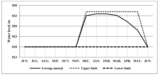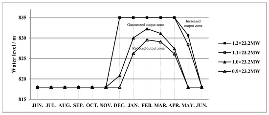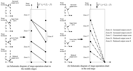 Reservoir operation rules are varied [16,17,18], and an often-used rule is the reservoir operation chart nowadays. A reservoir operation chart is the graphical result of operation rules, and it contains three main kinds of operation curves and operation zones. Direct and concise is the notable feature of reservoir operation chart, the reservoir operation decision made by the operation chart is well in accord with the operation principle. At present, the reservoir operation chart has been widely applied in actual production.