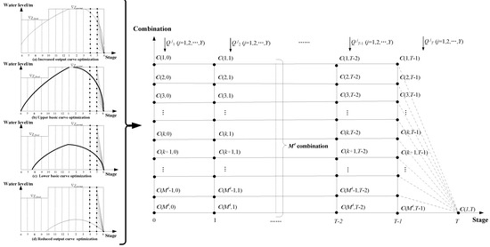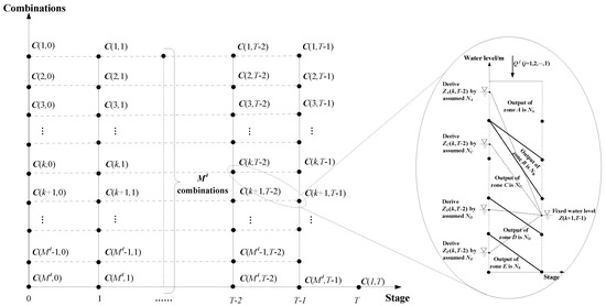 All the possible discretized water level combinations of the four operation curves over the whole operation period are shown in Figure 4, where C(k, t) represents the kth combination in the tth stage, k = 1, 2, …, Mn − 1, Mn; n is the count of the operation curves in the operation chart; M is the number of discrete points of the feasible water level range; t is the index of stage, and t = 1, 2, …, T; T is the total number of stages over the entire planning horizon.