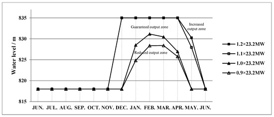 There are three types of output in the actual hydropower station dispatching, i.e., guaranteed output, increased output, and reduced output. Correspondingly, there are three kinds of operation zones in the operation chart, which are the guaranteed output zone, the increased output zone and the reduced output zone. So, there are three types of operation curves in a reservoir operation chart, i.e., the basic operation curves (including the upper and lower basic operation curve), the increased output curves, and the reduced output curves. The upper basic operation curve and lower basic operation curve corresponds to the upper and lower boundary of guaranteed output zone.