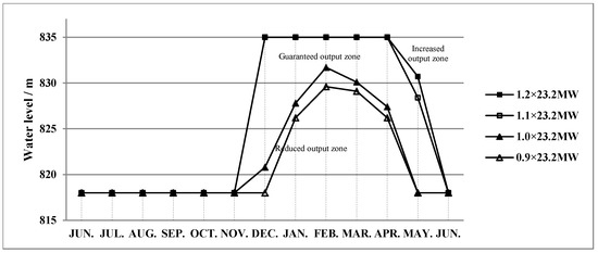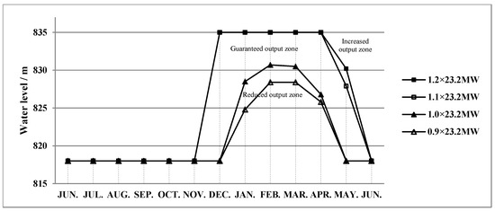 For the conventional method, when the guaranteed output of the reservoir is 23.2 MW, the simulation results of the conventional reservoir operation chart through a long series of historical runoff can be obtained. The assurance rate is 93% and the power generation is 496.3 GWh. The corresponding reservoir operation chart is shown in Figure 8. Where, the 1.0 × 23.2 MW corresponds to the basic operation curve, the 1.1 × 23.2 MW corresponds to the increased output curve whose output is 1.1 times the guaranteed output, the 1.2 × 23.2 MW corresponds to the increased output curve whose output is 1.2 times the guaranteed output, and the 0.9 × 23.2 MW corresponds to the reduced output curve whose output is 0.9 times the guaranteed output.