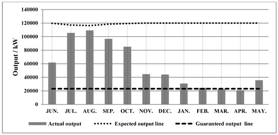 Compared the Figure 11 with Figure 9, it can be seen that the guaranteed output zone of the Figure 11 has relatively expanded, and the reduced output zone has narrowed down. Generally, this change will make the assurance rate increase if the guaranteed output unchanged. However, the guaranteed output increased, which is changed to 23.0 MW from 22.4 MW at this moment, so the assurance rate remains unchanged.