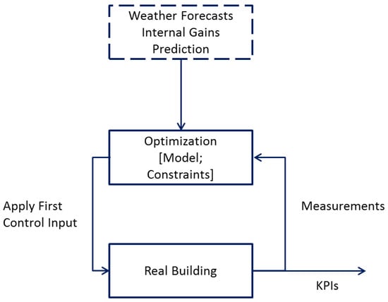In MPC application in buildings, typically, we assume that a model of the controlled process (i.e., the real building in our case) as well as (weather, occupancy, etc.) forecasts for a predefined time window are available. This way, a constrained optimisation problem can be formulated and solved for a predefined period in the future, generating a control signal (or control strategy) which is optimised for the system on the basis of a defined cost function and a set of (visual, thermal, air-quality, etc.) comfort constraints. The quality of the final control strategy is evaluated under a set of Key Performance Indicators (KPIs). A high-level schematic of the overall approach is shown in Figure 1.