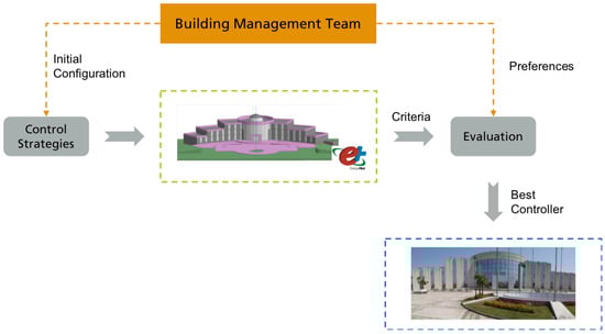 Equivalently, the building management team could provide a list with pre-defined control strategies (e.g., more or less pre-cooling hours, different room setpoint schedules, different heating curves for the boiler operation, etc.) along with a list of objectives (called criteria in MCDA literature) to be optimised (e.g., total energy consumption, monetary cost, thermal and visual comfort, etc.). In addition, for each objective/criterion, a “preference” value (e.g., a number between 0 and 10) needs to be provided, expressing the relative “importance” of each criterion. Finally, each control strategy is evaluated on the available simulation model and based on the different values for each criterion an MCDA algorithm returns a ranking for each control strategy and the highest-ranking control is applied to the building. The overall methodology is shown in Figure 3.