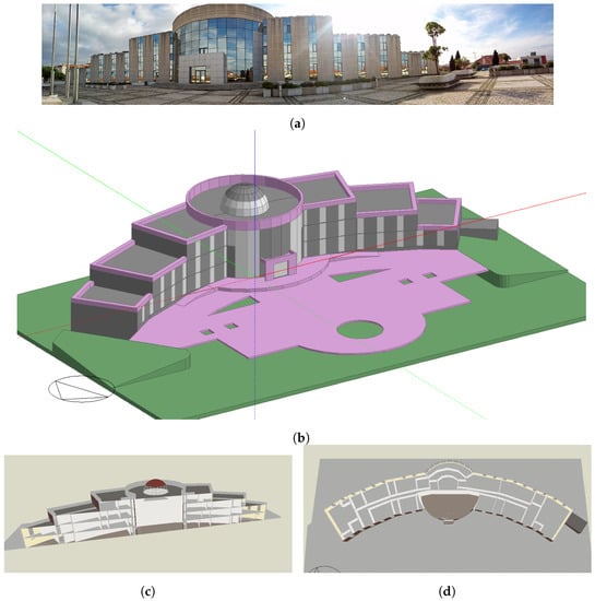 The Mafra City Hall Building: (a) front view of the Mafra City Hall Building; (b) simulation of Mafra City Hall Building using DesignBuilder Software []; (c) the Mafra City Hall Building cut-off; and (d) the Mafra City Hall Building floor-plan.