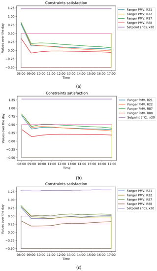 More recent work in the same direction [,,,,,,] uses the available simulation model to construct a simple meta-model of the building online, which is able to predict the behavior of the building only for a limited prediction horizon. This meta-model is used for the optimisation of the control strategy, in an effort to reduce the number of simulation calls to the “expensive" simulation model. The problem with most approaches here stems from the multi-objective formulation of the optimisation algorithm [,,], in which the objective function to be optimised is a properly weighted combination of a cost function (e.g., the total energy consumption) and a term that expresses the thermal discomfort for the entire building (in most cases, average discomfort values for all offices are calculated, in contrast to normative guidelines [,]). In large-scale real-world setups, hand-tuning a proper weighting between the active constraints being generic enough to capture all the real-world variations (e.g., varying daily weather conditions, occupant actions, etc.) is a formidable task. For example, in an office building with 30 offices, where thermal and visual comfort constraints need to be met, minimising the energy consumption of the building while giving priority to thermal over visual comfort constraints requires: (i) proper normalisation between the energy consumption, the thermal comfort and visual comfort constraints values so no term is dominating the combined cost function []; and (ii) adjusting the relative importance of visual over thermal comfort constraints Finally, constrained Bayesian optimisation has been used to address these shortcomings [], but, even though this approach resulted in a successful real-world application, Bayesian optimisation does not scale well in problems with a high number of optimisation parameters [].