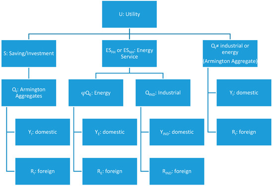 As previous studies [15,26] have made clear that a total rebound effect can only be determined using a general equilibrium model that allows for price movements, this is the methodology that we have applied. Our estimation utilizes a nested constant elasticity of substitution (CES) functional form in order to allow for sensitivity analysis with respect to elasticities of substitution with the energy service nest as in Lecca et al. [26]. In order to accurately capture demand responses to energy efficiency in the Turkish context, this study also incorporates energy theft. In the process of production and distribution of energy there may be losses due to both technical and nontechnical reasons. Nontechnical losses can be described as energy theft and consist of fraud (meter tampering), stealing (illegal connections), billing irregularities, and unpaid bills [5]. Distribution companies in Turkey cut off power in case of unpaid bills and billing irregularities therefore energy theft will refer specifically to energy stealing and fraud.