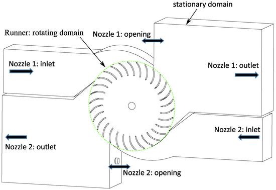 An unstructured tetrahedral mesh with hexahedral elements in the near wall region was used to discretize the computational domain. The computational domain of the double-nozzle turbine is shown in Figure 4. Note that the distinction between Nozzle 1 and 2 is arbitrary and that the simulations were of the complete dual-nozzle geometry; no assumption of flow symmetry was made to reduce the computational domain. A typical computational mesh is shown in Figure 5. The computational domain was divided into two sub-domains: stationary (nozzle) and rotating (runner). A general grid interface (GGI) connected the two domains, which allows updating on interface position at each time step while the relative positions of the grids on each side of the interface change due to runner rotation [13]. The GGI uses interpolation to communicate between non-matching grid points [13].
