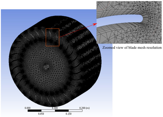 A grid independence test was conducted by refining the grid size until an acceptable accuracy was achieved for the power output . Grid resolution was systematically assessed by computing the value of , which is the non-dimensional distance of the first mesh node from the wall, to ensure 5 because the SST model gives better accuracy at 5 [13,15]. For a single-nozzle turbine, a total of 8.4 million elements was required to make nearly independent of the grid; there was less than 0.1% uncertainty in the computed results due to grid resolution. Similarly, for the double-nozzle turbine, a total of 13.1 million elements produced a at the maximum efficiency point, flow rate = 46 lps, head H = 1.337 m and runner speed N = 199.1 revolutions per minute (RPM), whose numerical uncertainty due to grid resolution is about 0.18% as shown in Table 2. A detailed analysis and results for a single-nozzle turbine can be found in references [7,10]. The inlet and outlet boundary conditions were specified using the experimentally tested values for the operating head H and flow rate Q respectively. Total pressure corresponding to H was specified at the inlet with the turbulence intensity of 5%. Mass flow rate was specified at the outlet. The openings shown in Figure 4, sometimes called “vents”, allow the free flow of air, but not water, in and out of the computational domain. Most commercial crossflow turbines have vents to maintain free-surface flow in the runner and to ensure that the runner entry is at atmospheric pressure. Computationally, the “opening” type boundary condition was specified for the vents. A uniform profile of the inlet flow was assumed at the upstream boundaries of the computational domain shown in Figure 4 as no experimental data on velocity profile was available. The effect of non-uniformity at the inlet on the runner performance should be small as the inlet was kept far upstream from the runner. The location of the inlets was identical to that of the single inlets in [7,10]. For the single nozzle, the maximum relative error between the experimental and CFD results for was 3.84% at = 46 lps and H = 1.337 m, and 0.51% at , which is within the numerical uncertainty mentioned above. This is an accurate prediction of the turbine performance. Given the similarity between the meshes used for the single and dual nozzle simulations, we expect a similar maximum relative error, but we emphasize that there are no experimental studies of dual nozzle crossflow turbines with which to compare the simulations.