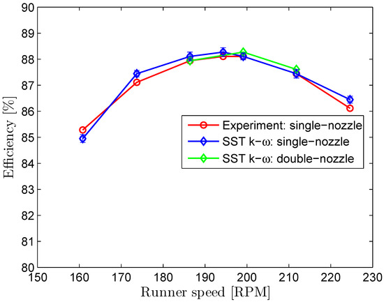 The performance comparison is shown in Figure 6. The double-nozzle turbine achieved a slightly greater maximum efficiency than the single-nozzle: 89.12%, compared to the measured [5], and 88.45% from the RANS computations [10]. Thus the double-nozzle performance is similar to that of the single-nozzle considering the numerical uncertainty mentioned above. This is a remarkable performance that justifies the use of two nozzles without having to redesign the nozzle or the runner. It is clear from Figure 6 that adding the second nozzle does not change for maximum efficiency. This is to be expected from the analysis of [7] for the optimum speed if it is further assumed that the flows leaving the first stages do not interfere with each other. Therefore, the power density, which is the total power produced per unit runner volume, is doubled for the same runner.