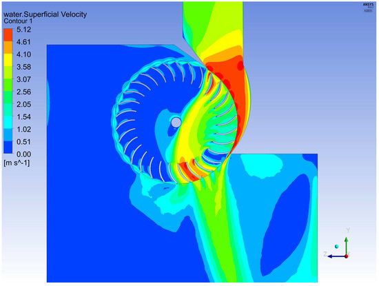 Contours of mean water velocity in the single-nozzle turbine at maximum efficiency [ = 46 lps, H = 1.337 m, and = 199 RPM]. Note that the flow is confined to less than of the runner periphery.