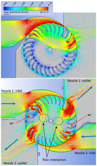 The contours of the mean water velocity vectors in the double-nozzle runner at Q = 40 lps is shown in Figure 11; there is no deflection of the two flow streams as observed at . This indicates that a double-nozzle turbine designed with a smaller entry arc angle at is most likely to avoid deflection of the flow streams in the runner. Moreover, Figure 11 shows no flow separation on the blades at both stages, which is one of the important criteria for maximum efficiency. This is due to the fact that the entry flow angle , not shown here, is close to the outer blade angle . At very low part-flow operation, Q = 20 lps, the flow streams are well separated in the runner with no deflection as Figure 13. Also there is no flow separation on the blades.