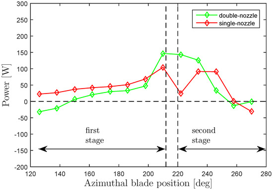 Comparison of stage performances for the single- and double-nozzle turbines [ = 46 lps per nozzle, H = 1.33 m and = 199 RPM]. The negative power indicates that those blades lose power to the flow.