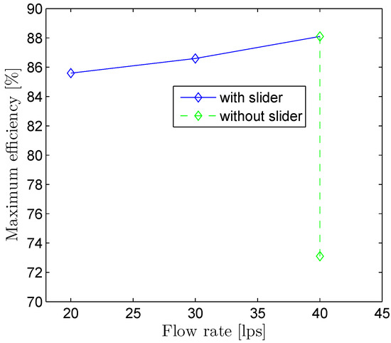 At lps and without the slider, the total velocity at runner entry, , where and are the radial and tangential velocities respectively, dropped significantly from the ideal value of 5.12 m/s (=), Figure 12. This showed that H was not converted into kinetic energy. As a result, the efficiency decreased considerably. In contrast, the slider maintained close to 5.12 m/s, indicating that H is fully converted into kinetic energy. This demonstrates that the angular momentum flux at the runner entry has increased compared to the case without the slider, which is the reason for the improved efficiency.