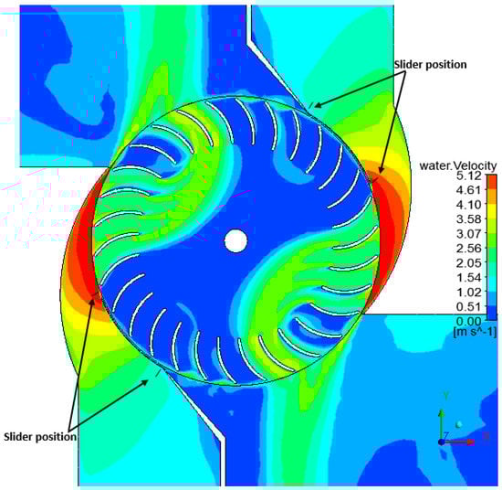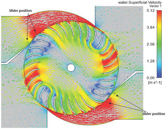 Mean water velocity vectors at part-flow operation at maximum efficiency [Q = 40 lps, H = 1.337 m, = 199 RPM, and ]. It is noted that only the inlet portion of the slider in the nozzle section has been modelled. The end of the slider, labeled the “slider position” for and lps is shown for both nozzles.